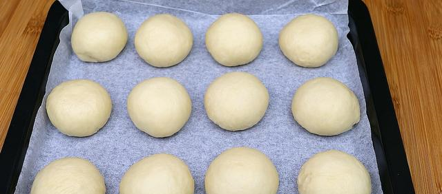 3、剛?cè)嗪玫拿鎴F是不光滑的,先在案板上抹一層薄油,抹油可以起到防粘的作用,再把揉好的面團放在案板上,反復的揉搓一下,直到面團的表面光滑之后再搓成長條。然后給它切成均勻的面劑子,我這里下的面劑子是65克一個,把劑子由外向里反復的折疊,給面劑子上勁這樣可以使面包烤好之后更筋道,同時也要把表面揉至光滑,整理成圓形,把收口處捏緊,在案板上再搓一下讓它更圓就可以了。烤盤上鋪一層油紙,把面劑子均勻地擺在上面,中間要留有一點空隙,蓋上保鮮膜,常溫下發(fā)酵。如(圖下)