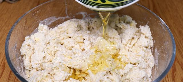 2、等到把面粉攪成面絮狀之后,往里面加入50克玉米油,我這里之所以選擇用玉米油,是因為玉米油的氣味比較低,基本上沒有什么氣味,而如果選擇用菜籽油或者別的油,氣味比較重,烘培出來的成品影響口感,如果條件允許的話,還可以選擇用黃油。把玉米油倒在面面絮上之后,再下手和面,直到揉成一個稍微偏軟的光滑面團即可。