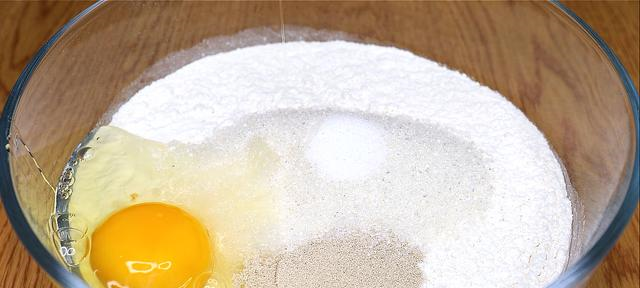 1、面包要想做得好,選擇面粉很重要。低筋面粉可以烘培一些餅干,桃酥等蓬松酥脆的西點。中筋面粉介于高筋和低筋之間,可以做包子,饅頭,面條等。高筋面粉,蛋白質(zhì)含量較高的面粉,顏色較深,具有活性且光滑,手抓不易成團,因為蛋白質(zhì)含量高,所以用來制作具有彈性有嚼勁的面包和吐司等。今天我們用的是500克高筋面粉加5克酵母,3克鹽,一個雞蛋,50克白糖,用筷子先把這幾樣食材全部都攪拌均勻,再往里面分次少量的加入240克的純牛奶,攪拌成大面絮。